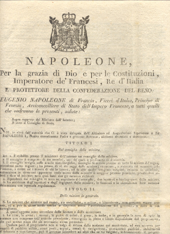 Editto napoleonico per il rapporto del Ministro dell’Interno circa l’elezione di un Consiglio delle miniere, la concessione delle licenze ed investiture per la ricerca ed escavazione delle miniere…