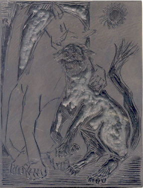Legno originale per xilografia, inciso sui due lati, di cm. 15 x 12, in acero di testa. Iniziali in alto per i gatti, firma in basso per l’ex libris.
