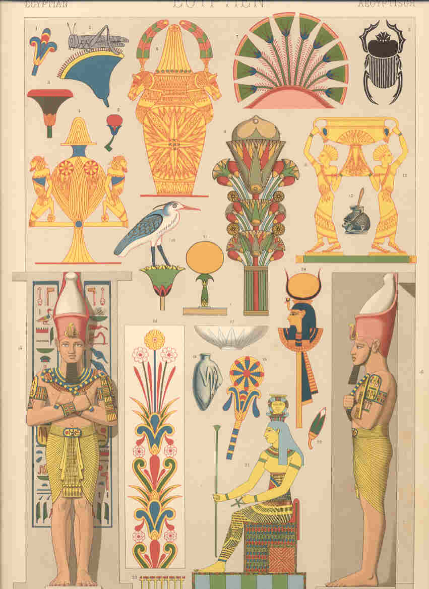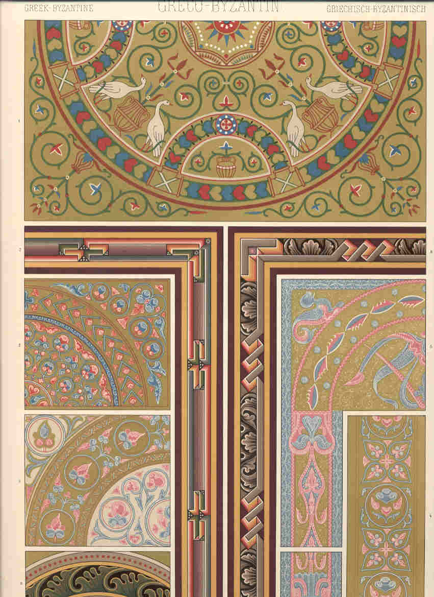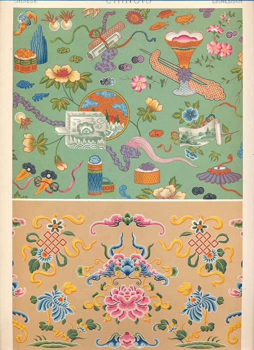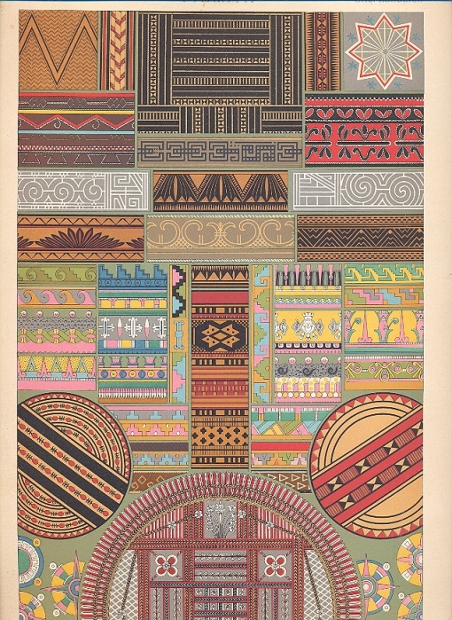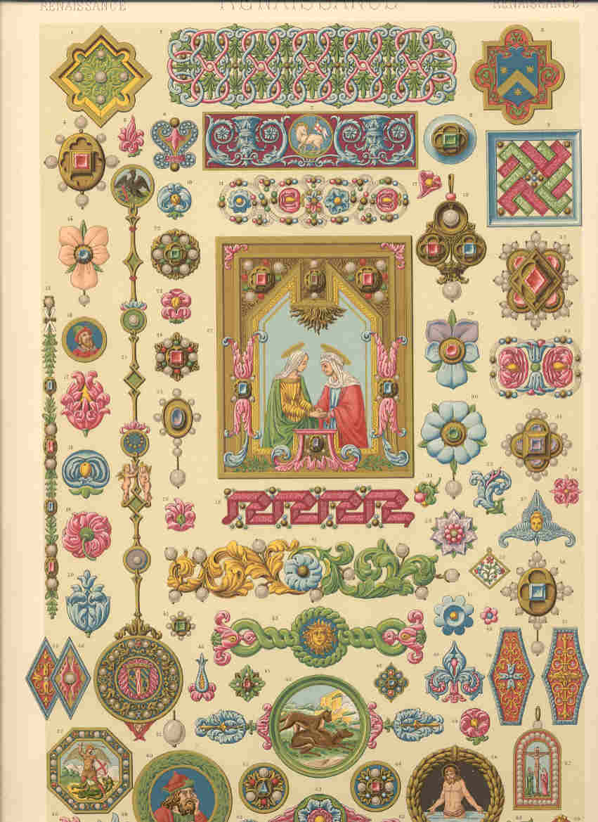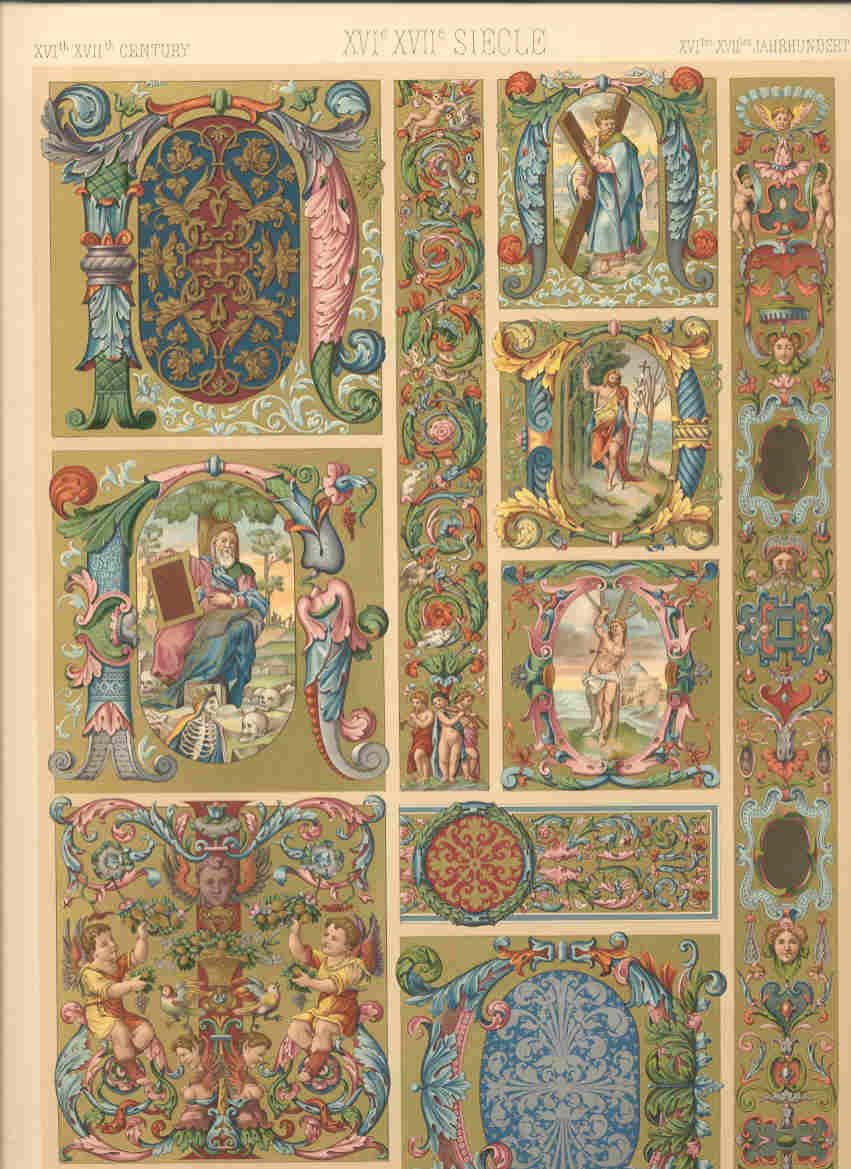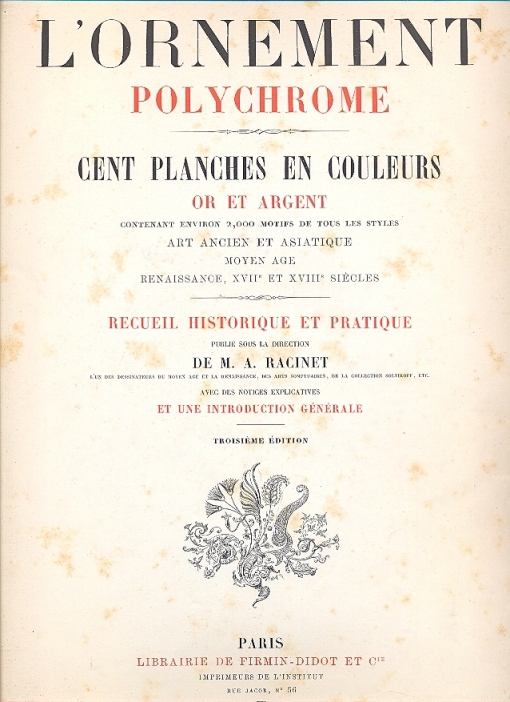 10 vol., in fol., m. tela. L’opera si presenta a fogli sciolti, raccolta in 10 cartelle, ognuna delle quali contiene 12 pregevoli cromolitografie + 12 cc.nn. di note (1 per ogni tav.). Tutti i piatti ant. delle cartelle hanno lettere in o. Le tavv. riproducono antichi disegni di ceramiche, mosaici, vetri, gioielli ….Fioriture. Lievi mende ai piatti.