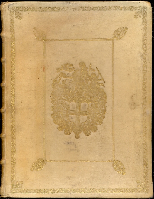 In 8°, p. perg., pp. 838 + cc.nn. 66. Front. con pregevole inc. (cm. 7,5 x 9,5) di Bleyswyk. Fregi al d. in o. Nervi. Pregevole è la rilegatura, con piatti ornati ed al centro, impresso, stemma araldico, tutto in o.