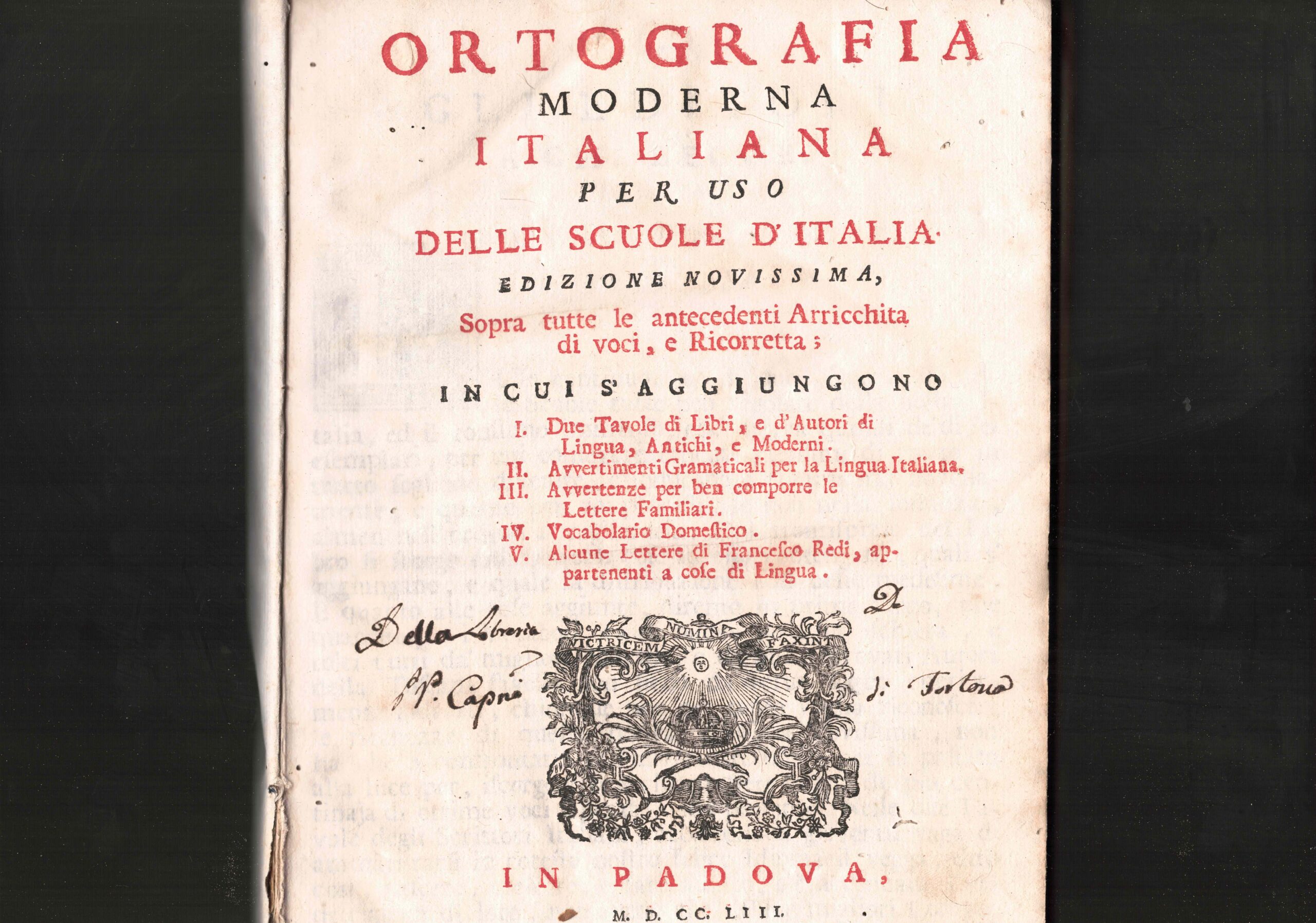 Ortografia moderna italiana per uso delle scuole d’Italia. Edizione novissima, sopra tutte le antecedenti arricchita di voci, e ricorretta; in cui s’aggiungono : I- Due tavole di libri, e di autori di lingua, antichi e moderni. II- Avvertimenti gramaticali per la lingua italiana. III- Avvertenze per ben comporre le lettere familiari. IV- Vocabolario domestico. V- Alcune lettere di Francesco Redi appartenenti a cose di lingua.