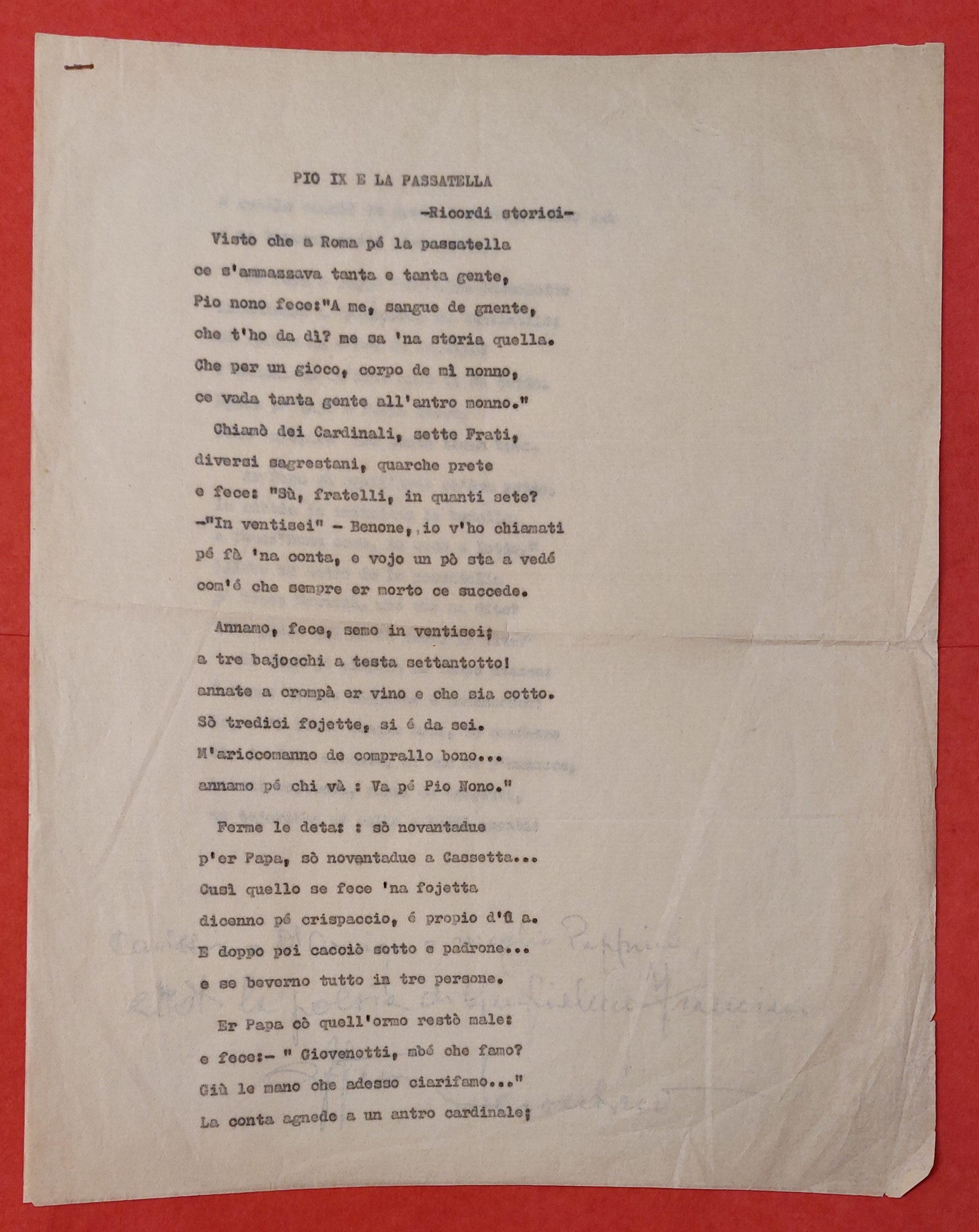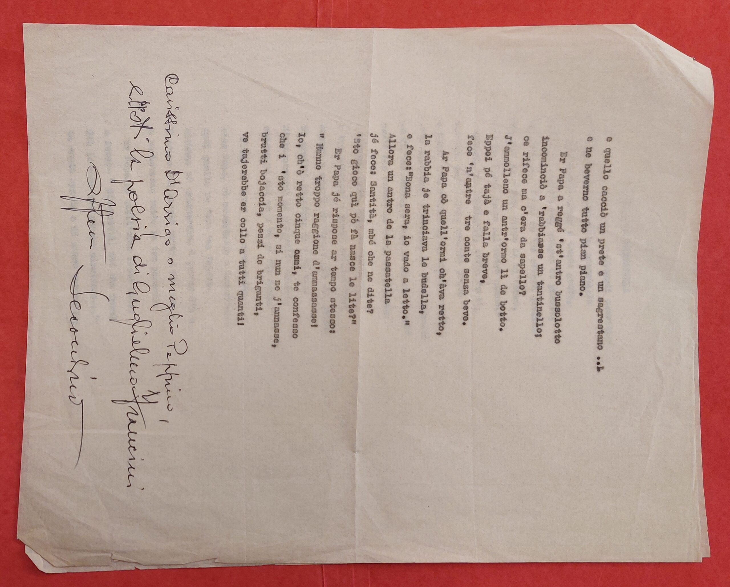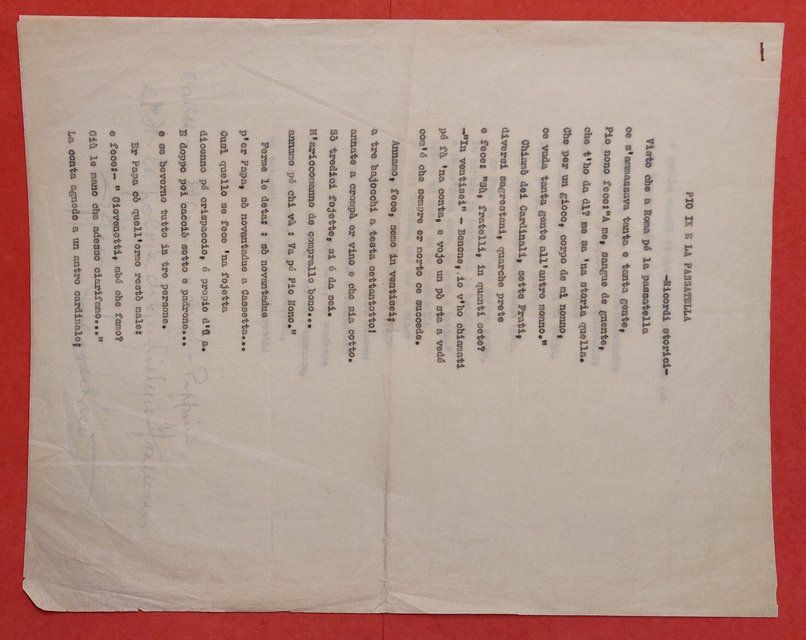 Lettera in 8°, pp.2. Lettera scritta su macchina da scrivere da anonimo contenente una poesia di Guglielmo Francini intitolata “Pio IX e la Passatella” (Ricordi Storici). La poesia è scritta in dialetto romanesco che re-interpreta una vecchia leggenda su Papa Sisto V e il gioco della passerella: il papa prova il gioco con i suoi cardinali, per capire perchè spesso finiva in violenza, per poi lui stesso cominciare a scagliarsi verso i cardinali che non volevano farlo bere. Presenta sul secondo foglio una dedica dal mittente (Servolini) al destinatario (Giuseppe D’Arrigo), e delle dei leggeri strappi in fondo a destra.