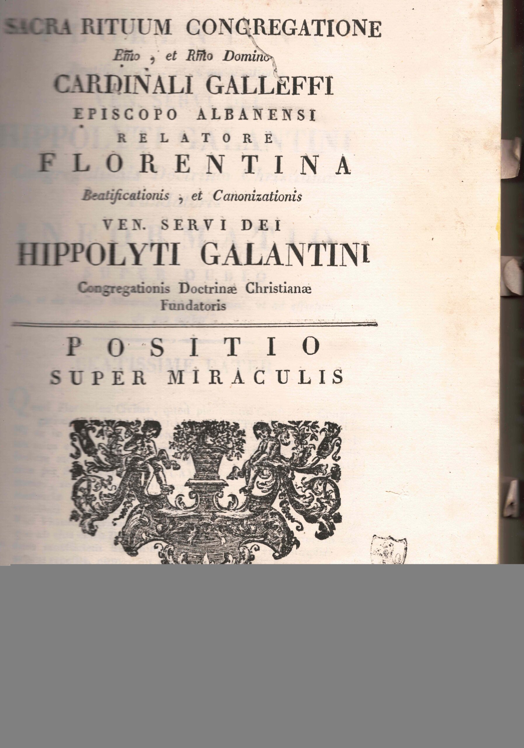 In 4°, m. pelle. L’opera contiene 4 prediche per la Beatificazione di Hippolyti Galatini, per un totale di pp. 175. Lettere in o. al d. Rare fioriture. Lievi mende alla cop. Antichi forellini su alcune pp. che ledono poche lettere.