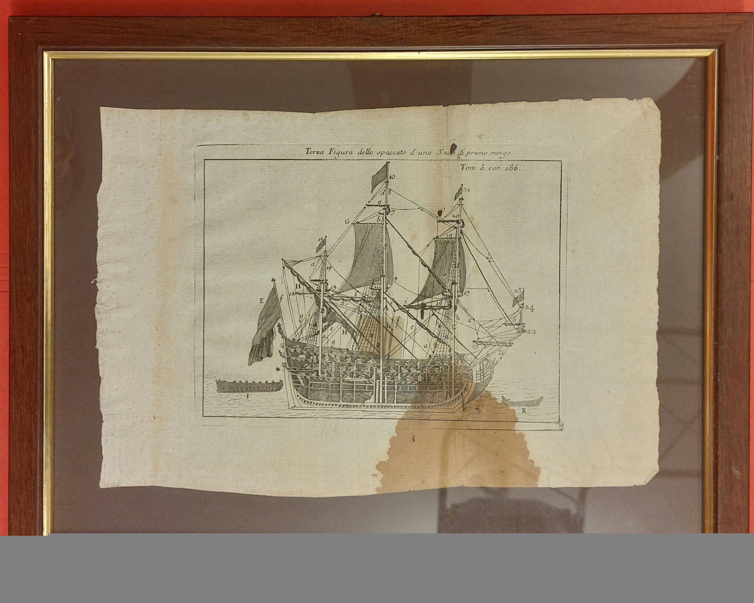 Incisione originale su rame (cm. 26,5×18,5, incorniaciato cm.34×26,3). Raffigura lo spaccato d’una nave di primo rango (Tom. 5. car. 186). Proveniente dal trattato in nove volumi “Le Spectacle de la Nature” di Noël Antoine Pluche (1688-1761, scrittore e naturalista francese). Considerato un grande trattato di divulgazione scientifica che fù. tradotto in tutta Europa e influenzò molti a diventare naturalisti.