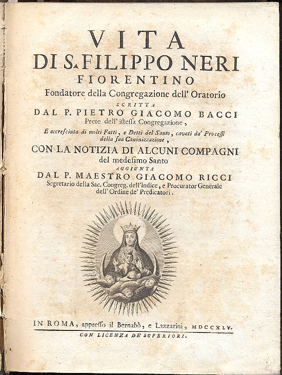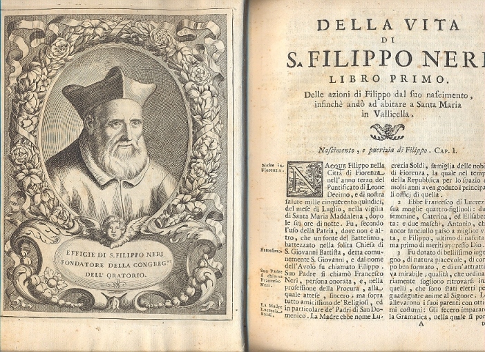 In 8°, m. pelle non coeva, cc.nn. 4 + pp. 398 + cc.nn. 25 ( di cui 24 di index e 1 di sonetto di S. Filippo) + pp. 173 di Breve notizia di alucni compagni… + 3 cc.nn. di Tavola.. Antip. con pregevole inc. raffigurante il ritratto del Santo. Front. fig. Capilettera. Finaline. Occhiello con strappo. Ultime pagine semi sciolte.